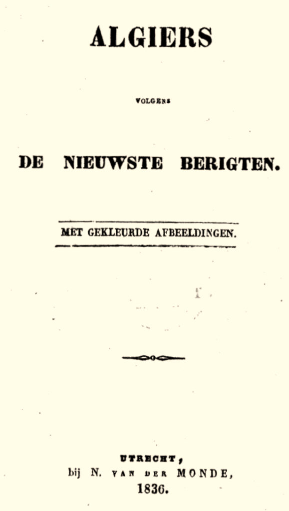 In 1836 verscheen in Nederland het, 191 bladzijden tellende en van gekleurde afbeeldingen voorziene boek “Algiers volgens de nieuwste berigten”, uitgegeven te Utrecht door N. van der Monde.