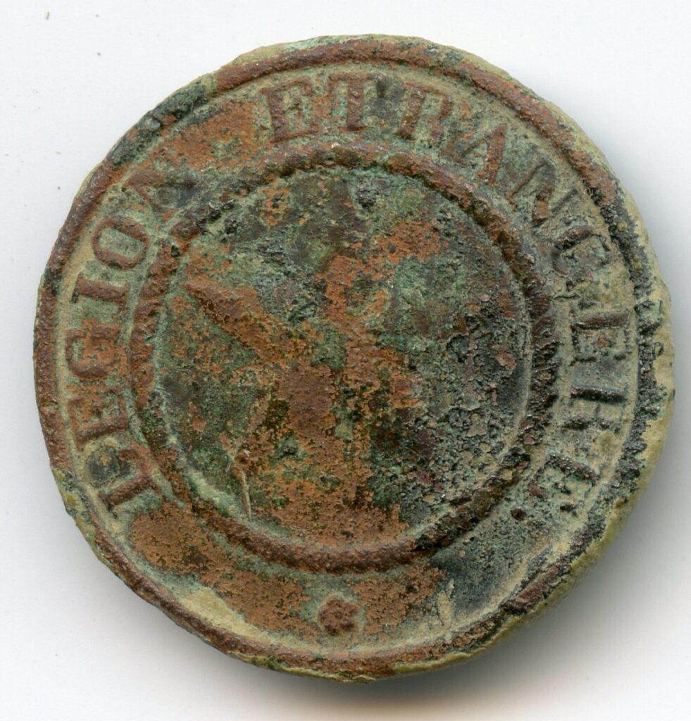 Het legioen vreemdelingen heeft dezelfde uniform als de Fransche linietroepen, slechts met dit onderscheid , dat zij , in plaats van roode opslagen, slechts een rood boordsel dragen , en in plaats van een nummer op de knoopen eene star hebben.