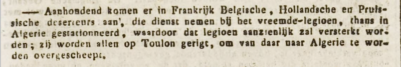 — Sedert eenen geruimen tijd bemerkt men , dat er onder de hollandsche garnizoenen aan de belgische grenzen eene groote desertie heerscht. Men berekent, dat er maandelijks 12 & 15 mannen wegloopen ; zoodra zij in België zijn aangekomen , stuurt men ze naar de Fransche grenzen, vanwaar zij naar Algerie worden gezonden.