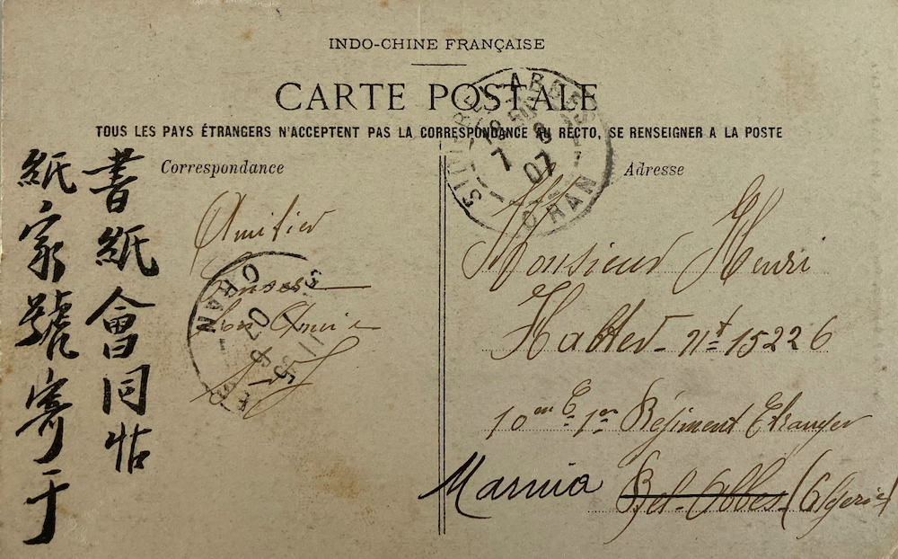 On the 7th of june 1907 a postcard sent from Vietry in Tonkin arrived in Sidi Bel Abbes (ORAN).