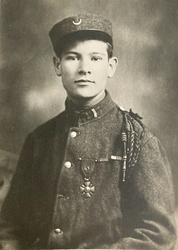 The double fourragère on his left shoulder, together with the regimental number 1 on the collar patches indicates he served in the French Foreign Legion.