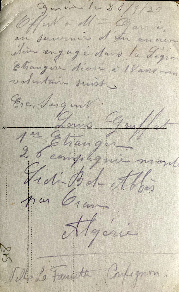 Offert a Mm Garnie en souvenir d’un ancien éléve engagé dans la Legion Etranger décoré a 18 ans com. volontaire Suisse.