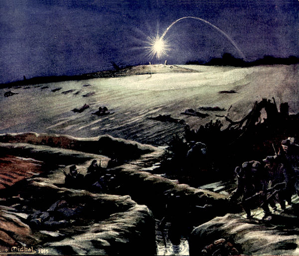 Het gelukte ons met niet veel verliezen daar te komen en tegen den avond verminderde het vuur. Wij hoorden de Duitschers zingen en babbelen, iets opgeschroefs was daarin, iets kunstmatigs als van hogerhand bevolen. dat bij het Fransche leger niet denkbaar is. Wij waren te diep ernstig na zo’n gruwelijke dag en niemand van de hogere dwong ons tot vrolijkheid. Ze riepen ons ook een en ander toe vrij hartelijk: