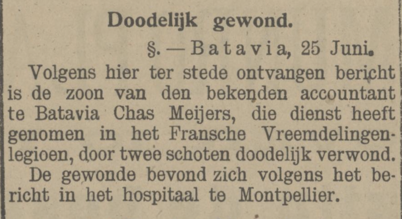 Volgens hier ter stede ontvangen bericht is de zoon van den bekenden accountant te Batavia, den heer Chas. Meyers, die dienst genomen heeft in het Fransche vreemdelingen-legioen door twee schoten doodelijk gewond. Hij bevindt zich volgens het bericht thans in het hospitaal te Montpellier.