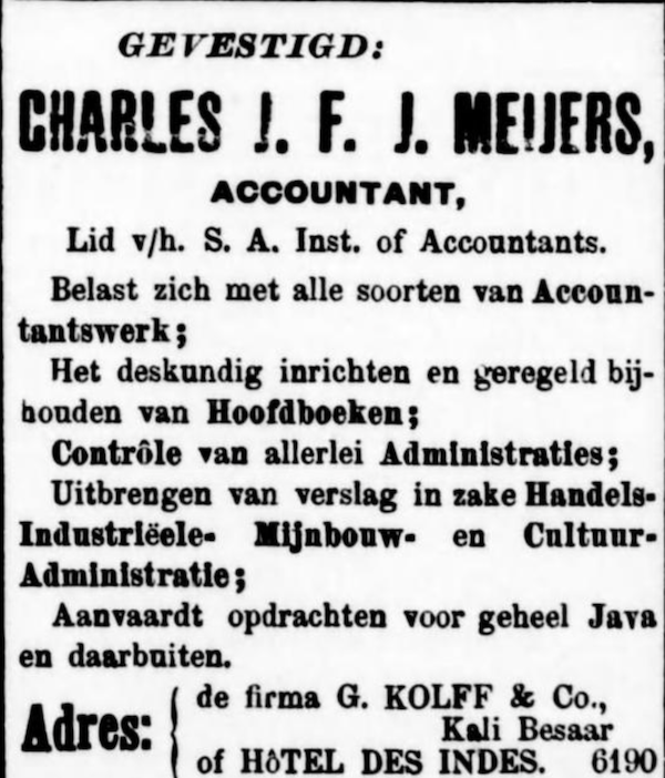 Een zoekopdracht in Delpher met de trefwoorden “Meijers, Accountant en Batavia” resulteerde in een aantal advertenties zoals deze van 30 augustus 1904 uit het “Bataviaasch nieuwsblad”