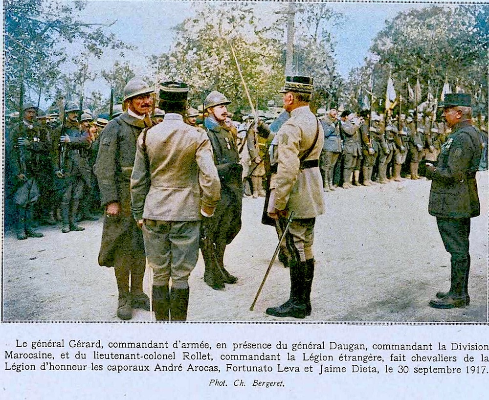 | 27 septembre 1917 : fait exceptionnel dans les annales militaires, le général Philippe Pétain, commandant en chef des Armées, remet au drapeau du R.M.L.E. la croix de la Légion d’Honneur. Trois caporaux: André Arrocas, Jaime Dieta et Fortunata Leva sont décorés de la Légion d’Honneur ils forment, avec l’adjudant-chef Mader, la garde du drapeau du R.M.L.E. |