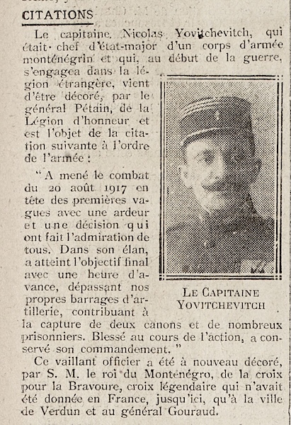 | 27-09-1917 | En station Revue du Colonel Cdt la 1o Brigade A 7h30 sur le Champ de Tir, le Colonel commandant la 1ere Brigade remet des croix de guerre au militaires du Regiment cites à l’ordre du C.A., de la D.M et de la Brigade. Assistent à cette revue: Le Lt Colonel Rollet, commandant le Régiment la Musique le 2e Bataillon les récipiendaires Revue du Général Commandant en Chef (N.d.S. no 2475 D.M./3 du 26 Septembre 1917 du Général Cdt la D.M.). A 16h30, sur le Polygone C. le Général Commandant en chef passe en revue toutes les troupes de la Division du Maroc. Au cours de cette revue, le Général en chef remet: 1o la Légion d’Honneur au Drapeau 2o une palme au Drapeau et au Lt Colonel Rollet ( ordre général no 900, du 20 Septembre 1917 de la IIo Armée ) 3o la croix de chevalier de la Légion d’Honneur au Capitaine Yovitchevitch ( ordre 5673 D. du 20 Septembre 1917 ) 4o la Médaille militaire au légionnaire de 1o cl Alcober de la 2o compagnie avec la croix de guerre avec palme |