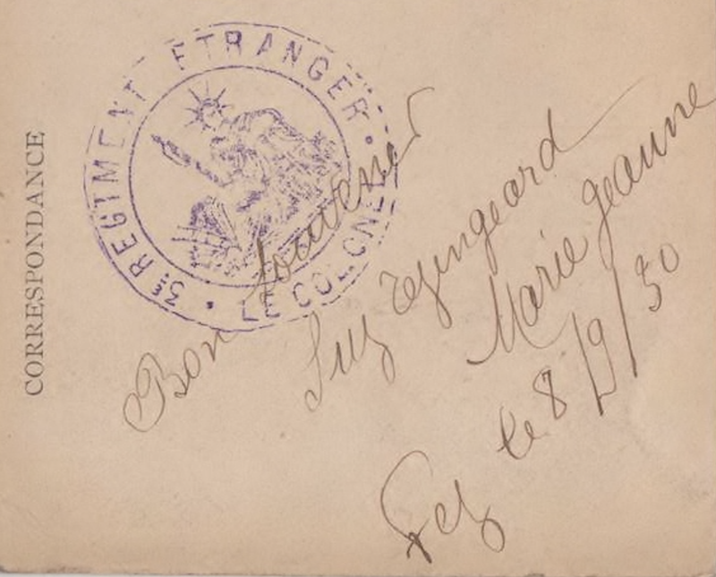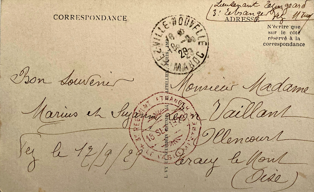 On the 17th of september 1929 a lieutenant of 3e Regiment Etranger of the French Foreign Legion stationed in Fez wrote a postcard to France. (see above).