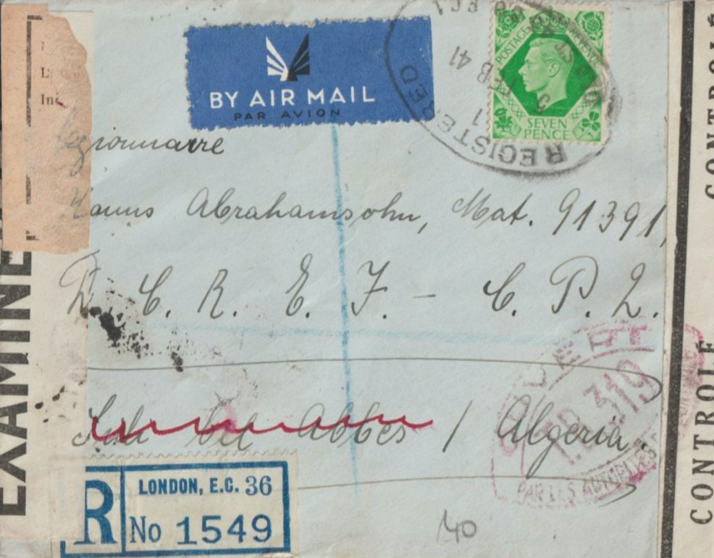 On the 5th of februari 1941, a woman called Betty Leurie [~], whose adres was 16 Edgwarebury London Edgware sent a registered letter to legionnaire Hans Abrahamsohn, Mat. 91.391 D.C.R.E.I. – C.P.2. Sidi bel Abbes Algeria.