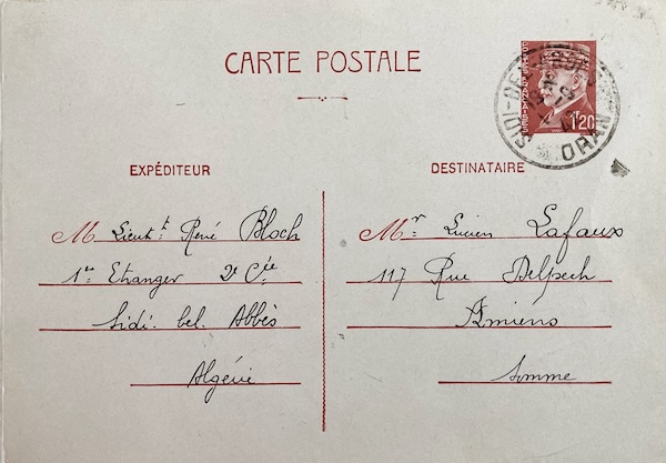 On the 1 of September 1942, Lieutenant René BLOCH serving in the 1er Etranger 2e Cie Sidi bel Abbes Algerie, wrote a Carte Postale ( Postcard ) to Mr Lucien LAFAUX 117 Rue Delpech Amiens Somme.