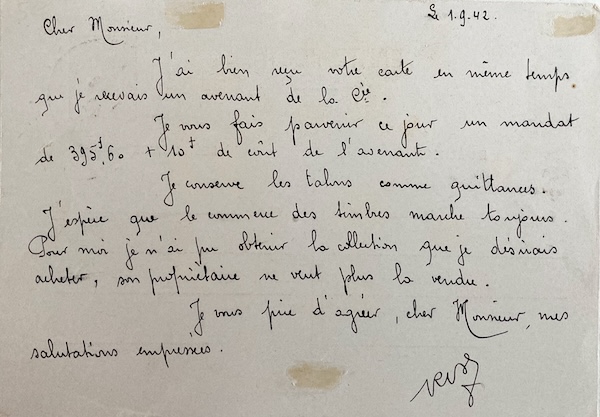 Je vous fais parvenir ce jour un mandat de 395,60 + 10% de cent de l’avenant.