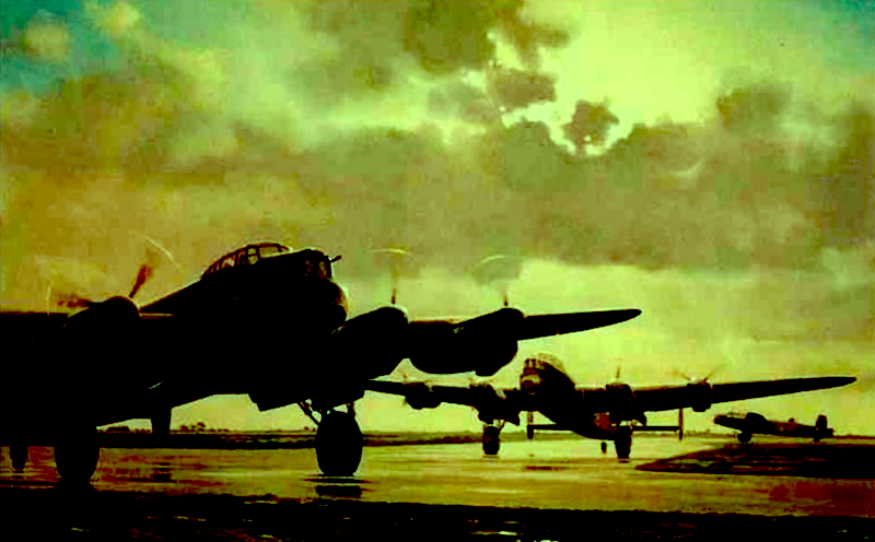 Bij één van de vele vliegtuigen stopte ze de truck. De intelligence-officer kwam naar ons toe en verzocht ons uit te stappen. Voor ons stond een reusachtige, zware Lancaster bommenwerper. De bemanning scarrelde wat rond in en om het toestel.