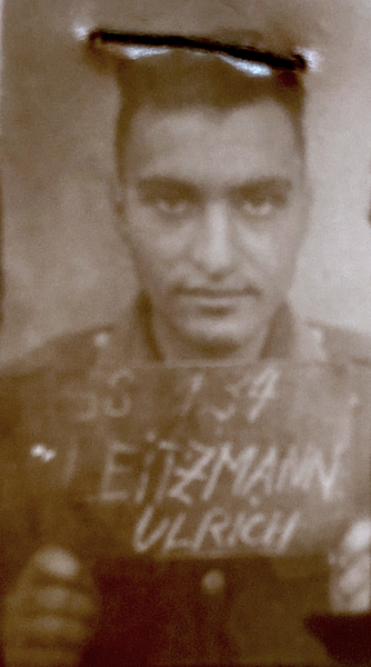Attached to this document is a photograph of Ulrich LEITZMANN holding a small blackboard on which his name and registration number in the Legion is written 61615.