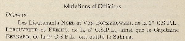 In het “Bulletin de liaison saharienne” van 1 december 1950 werd gepubliceerd dat Von Borzykowski, toen nog lieutenant de “Sahara” zou verlaten. Hij diende op dat moment bij het 1re CSPL , de afkorting voor Compagnie Saharienne Portée de la Légion. Dit waren gemotoriseerde eenheden van het Franse Vreemdelingenlegioen gespecialiseerd voor operaties in de woestijn ( Sahara ).