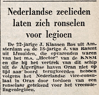 Op de redacties van verschillende Nederlandse kranten heeft men gisteren met spanning gelezen over de verdwijning van een 18-jarige Bosschenaar, A. v. lersel, aan de Zwitsers-Italiaanse grens. In het uit Limona (Italië) afkomstige bericht, werd gesuggereerd dat de Nederlander zou zijn geronseld voor het Vreemdelingenlegioen. Het zou in deze omgeving vaker voorkomen, dat iemand verdween om later te worden teruggevonden in het legioen.