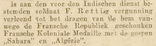 Het was in krantenberichten uit begin 1911 dat ik de naam van F. Rettig voor het eerst tegen kwam bij een onderzoek, naar KNIL militairen die toestemming kregen Franse onderscheidingen te dragen, .