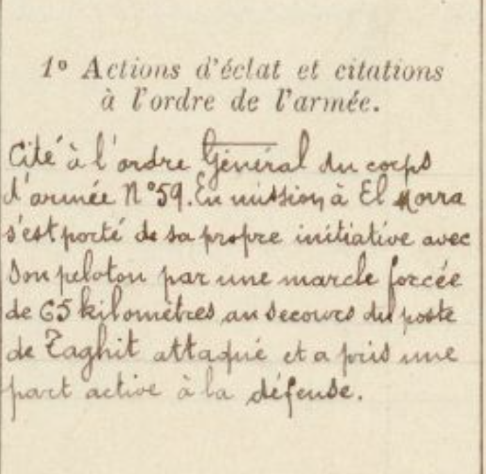 Le capitaine, grâce à d’habiles dispositions et une énergie communicative, réussit à repousser les assaillants qui revenaient continuellement à la charge et la poignée de braves qu’il commandait n’a pu qu’à force de courage et d’abnégation résister aux Marocains, en combattant un contre 10.