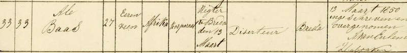 Op 13 maart 1850 werd in Tilburg ingeschreven in het gevangenisregister de 27 jaar oude Ale, Baas, Korporaal.