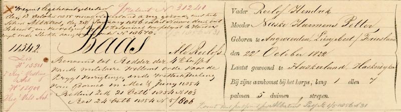 Opmerking: Volgens register Ale Roelofs Baas geb.22-10-1822 Angewierden Kunjebert z.v. Roelof Hendrik en Nieske Harms Petter, overl.3-3-1856 in het Hospitaal te Willemsoord.