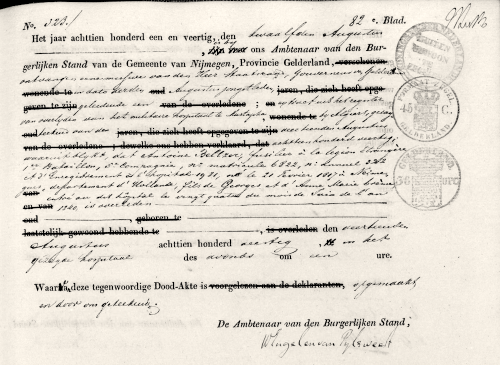 Een kennisgeving van zijn overlijden werd op 12 augustus 1841 ontvangen door de Ambtenaar van den Burgerlijken Stand van de Gemeente van Nijmegen, Provinicie Gelderland.