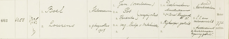 In 1926 werd in het Militieregister van Amsterdam [1] de op 9 augustus 1907 in Hilversum geboren Lourens Boel geregistreerd. Hij was de zoon van Jan Boel en Hendrika Pot.