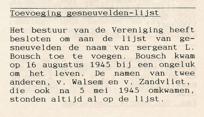 Volgens de overlijdensakte ( aktenr. 1945/A3889 ) is Lambert Bousch in Den Haag overleden in het Militaire hospitaal aan de Fluwelenburgwal op 16 augustus 1945 (om 22u00) en niet op de 15e, zoals vaak vermeld.