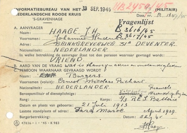 Op 18 augustus 1945, vulde Johannes Haage uit Deventer een vragenlijst in van het Informatiebureau van het Nederlandsche Roode Kruis in Den Haag.