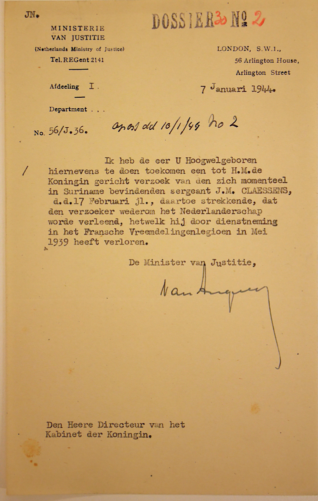 Bij besluit van 30 Juni 1944 geplaatst in de Staatsblad 4 September 1944 kreeg Johannes Claessens “wederom zijn Nederlanderschap verleend”, als No.10 op een lijst van 50.