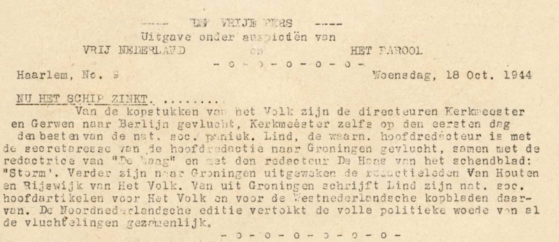 Op 18 oktober 1944 berichte de Vrije Pers hierover.
