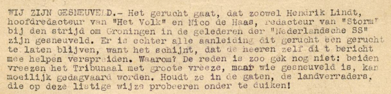 Er circuleerde het gerucht dat Nicolaas de Haas gesneuveld zou zijn, maar Hendrik Lindt scheen dit gerucht en dat van zijn eigen dood te hebben verspreid, zoals te lezen was in het Parool van 25 april 1945.