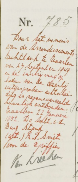 Door het vonnis van de Arrondissementsrechtbank te Haarlem van 27 september 1949 en de inschrijving van 22 januari 1952 te Haarlem werd het huwelijk van Nicolaas de Haas en Tine Woudt ontbonden.