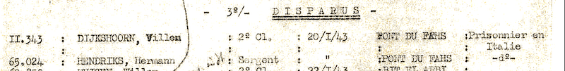 Op deze lijst stond met No Matricule 11343, Dijkshoorn, Willem legionair 2o Cl. die op 20 januari 1943 verdwenen was bij Pont du Fahs, met als opmerking dat hij krijgsgevangen was gemaakt en zich nu in Italië bevond.
