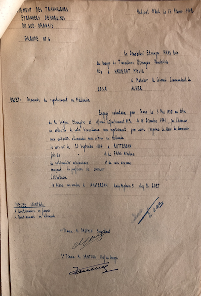 Op 13 februari 1942 diende Arie Faas een Nederlandse oud-legionair bij de Colonel Commandant van de D.D.S.A. in Algiers een verzoek in tot repatriëring naar Nederland.