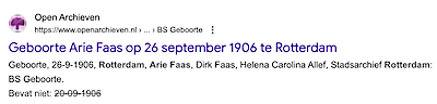 Een Arie Faas geboren op 20 september 1906 in Rotterdam kon ik zo snel niet vinden wel een Arie Faas die 6 dagen later ook in Rotterdam geboren, zoon van Dirk Faas en Helena Allef.