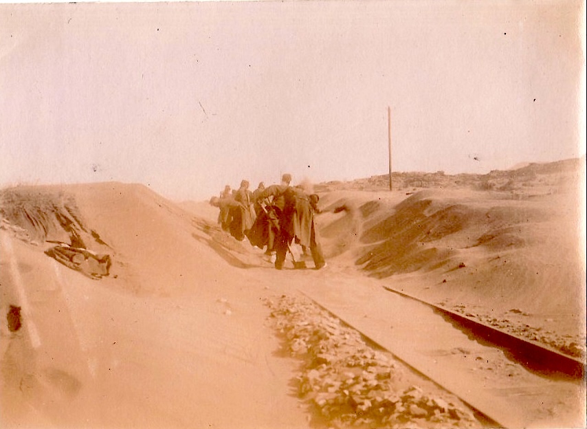 Legionairs scheppen zand weg van de spoorlijn.