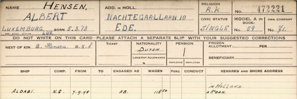 Hieruit blijkt dat Albert Hensen van 7 september 1945 tot 7 september 1946 op het schip de Aldabi voer.