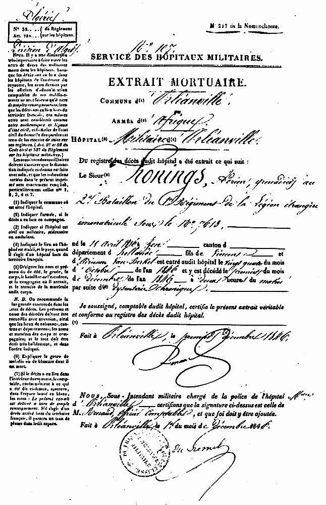 In het gemeentearchief van Son en Breugel bevindt zich een akte van overlijden, die een bepaald gevoel van droefheid oproept. Nu is een dergelijke akte nooit iets waarvan je vreugdevol gestemd wordt, maar dit geval is er een waarbij je je gedachten de vrije loop laat. Het betreft de vermelding (in ‘t frans) door de dienst van de militaire hospitalen in Orleanville (Noord-Afrika), Algerije, dat op 1 december van het jaar 1846 in Orleanville is overleden Adriaan Honings, geboren 15 april 1816 te Son, grenadier bij het 2e bataljon van het 1e regiment van het Vreemdelingen Legioen, legernummer 7613 aan chronische dysenterie in het hospitaal van die plaats waar hij sinds 24 oktober was opgenomen.
