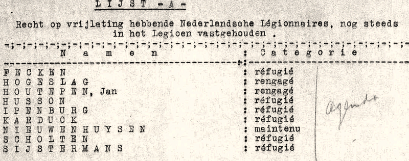 Boven de lijst staat “Recht op vrijlating hebbende Nederlandsche Legionairs in het Legioen vastgehouden”. Husson staat op deze lijst al réfugié, dat wil zeggen iemand die na 25 juni 1940 dienst in het Vreemdelingenlegioen had genomen.