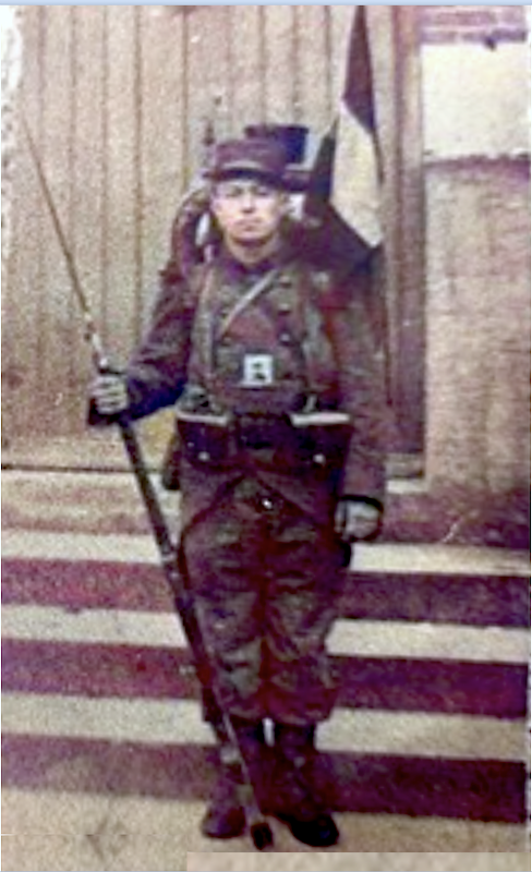 Of Franse vlag op de foto bij het gebouw achter hem hoort of dat hij dit voor de foto aan zijn tornister heeft vastgemaakt is niet goed te zien.
