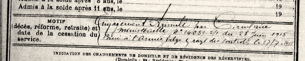 Zijn verbintenis werd op 28 juni 1915 geannuleerd naar aanleiding van een circulaire “14059 2/1”