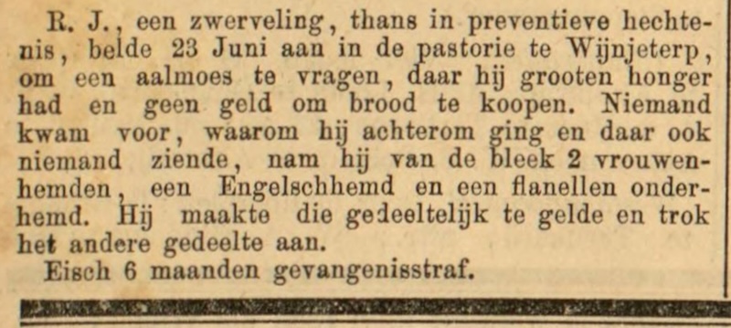 Je kon zijn cliënt moeilijk gebrek aan ondernemingsgeest verwijten, aldus de strafpleiter. „Dat er energie in hem steekt, blijkt uit zijn lange voetreizen. Gebrek, honger, geen zin om zich te verrijken, dreven hem tot zijn daad.” De raadsheren van het gerechtshof kozen voor een tussenoplossing. Op 9 augustus 1899 veroordeelden ze Rinse Jansen tot twee maanden celstraf.