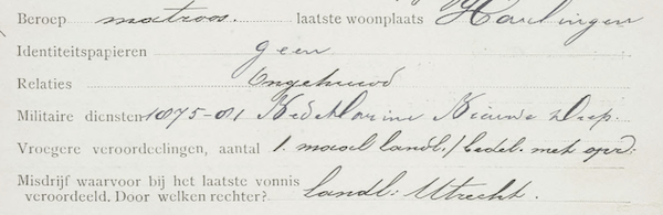 Genoteerd werd ook dat hij van 1875 tot 1881 bij de Nederlandse Marine in Nieuwe Diep was geweest.