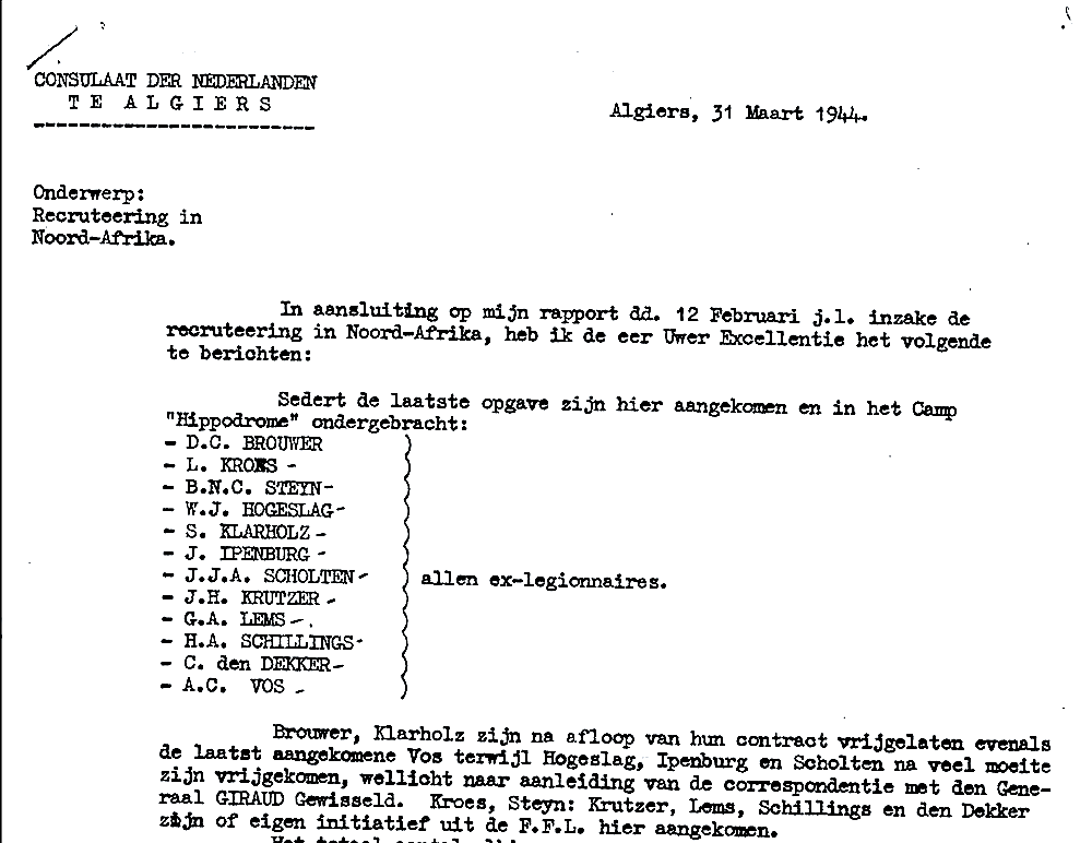 Op 31 maart 1944 werd vanuit het Consulaat der Nederlanden te Algiers een rapport verstuurd met als onderwerp: Recruteering in Noord-Afrika.