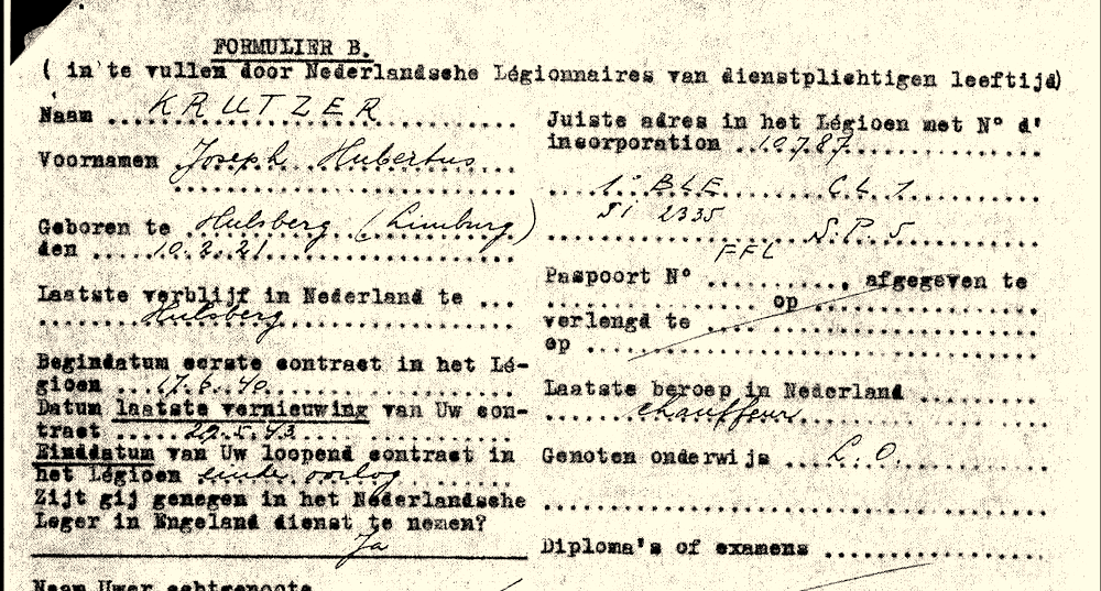 Zo ook in het geval van Joseph Hubertus Krutzer. Op Formulier B formeel “in te vullen door Nederlandsche Legionnaires van dienstplichtigen leeftijd” dat Nederlanders die in het Vreemdelingenlegioen gediend hadden maar die dienst wilden nemen in het Nederlandse leger in moesten vullen, schreef hij het volgende.
