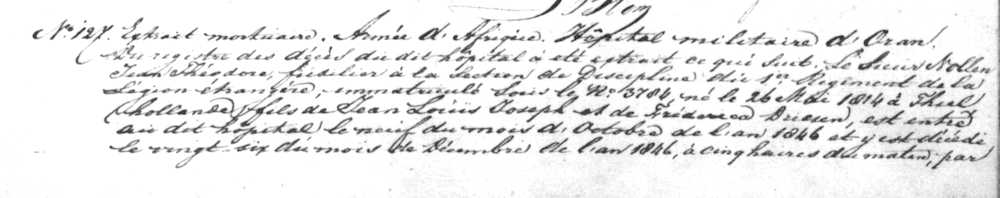 Daarin werd vastgelegd dat op 26 december 1846, fuselier Jean Theodore Nollen van de Section de Discipline du 1er Régiment de la Légion Etrangere, ingeschreven onder het nummer 3786, was overleden aan “bronchise”.