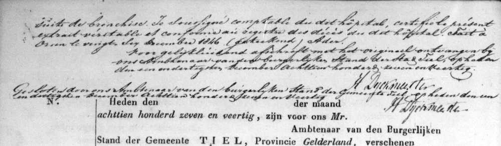 | [1] | Gelders Archief te Arnhem, BS Overlijden Burgerlijke stand Gelderland, dubbelen, Tiel, archief 0207, inventarisnummer 1485.01, 31-12-1847, Tiel, Overlijdensregister, aktenummer 127 |