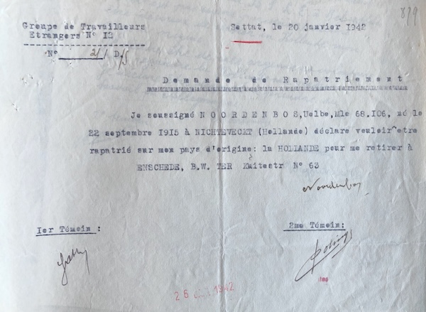 Ongeveer drie maanden nadat hij zijn verzoek had ingediend, op 4 mei 1942, werd er namens de Deutsche Waffenstillstandskommission (WAKO) een brief geschreven aan de Franse delegatie betreffende repatriëring van twee Belgische en twee Nederlands oud-legionairs.