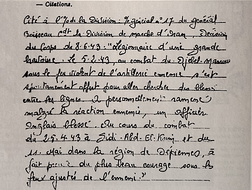 Ook toonde hij op 25 april 1943 tijdens de Slag bij Sidi Abd el Kerim op 4 mei 1943 in de Regio Depiennnes, zeer moedig gedrag onder vijandelijk vuur.