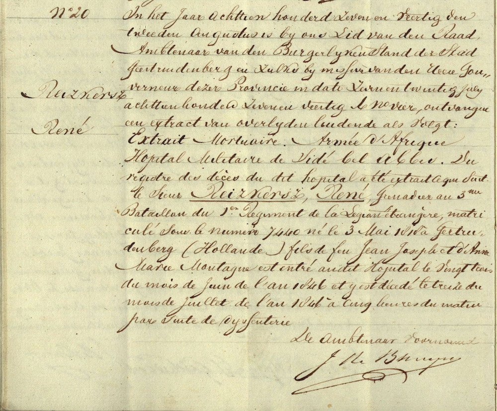 Du registre des decès du dit hopital a été extrait le qui suit le Sieur Reizkersz, René, Grenadier au 3me Bataillon du 1er Regiment de la Legion etrangere, matriculé sous le numero 7440