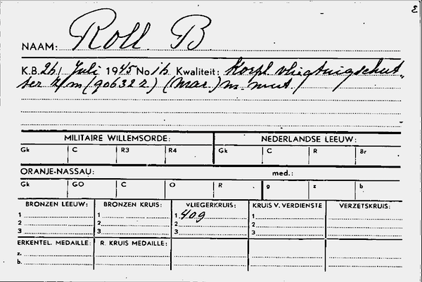 Ik had hier nog aan toe willen voegen, dat wat Bob Roll uniek maakte was dat hij op 26 juli 1945 onderscheiden werd met het Vliegerkruis Koninklijk besluit: 16 Registernummer: 409.
